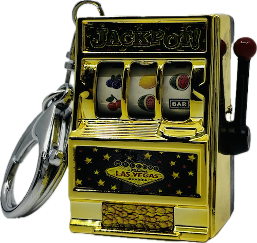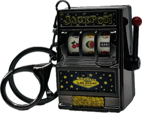 Slot Machine Keychain - Pink, Gold oor Black Slot Machine Key-ring Capture the excitement of striking the jackpot with this detailed, working slot machine keychain. Designed as an accurate miniature, it includes a pullable wheel and handle for authentic reel spinning. Ideal as a keepsake from the Entertainment Capital of the World or a distinctive gift, this key-ring adds a dynamic flair to any set.